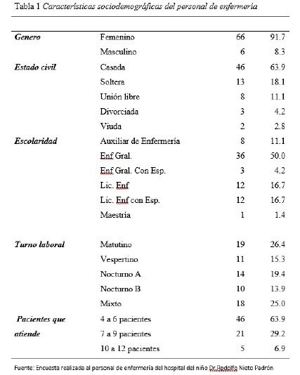 La edad promedio de enfermería fue de 39.68 años, predominó el sexo femenino nueve de 10 enfermeras, con pareja, enfermeras generales o técnicas la mitad de las participantes y un tercio de licenciadas en enfermería, un índice enfermera paciente de 4 a 6 con un 63.9%. La antigüedad laboral del personal con una media de 12.50 años.
