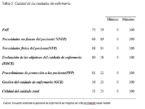 Calidad de los cuidados de enfermería la media más alta fue para los índices de las necesidades físicas del paciente de un 88, y el promedios más bajo a necesidades no física del paciente o atención psicosocial con un índice de 66, y gestión del cuidado de enfermería 50. La media global del índice de la calidad del cuidado fue de 51.