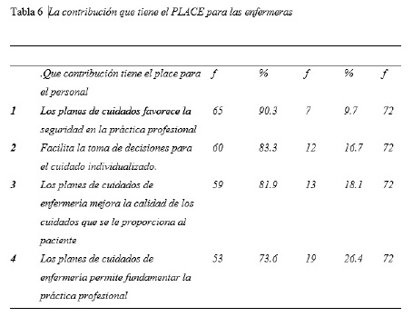 Contribución para las enfermeras la implementación de los PLACE. En las intervenciones si cumple 76.4%, en los diagnósticos 75% y en los resultados con 65.3%.
