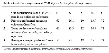 Contribución que tiene el PLACE para la disciplina de enfermería el 86.1% que la práctica profesional basada en evidencia científica, 83.3% facilita tomar decisiones basada en información confiable, accesible y oportuna y el 75% que favorece el prestigio e imagen profesional ante la sociedad y otras disciplinas.