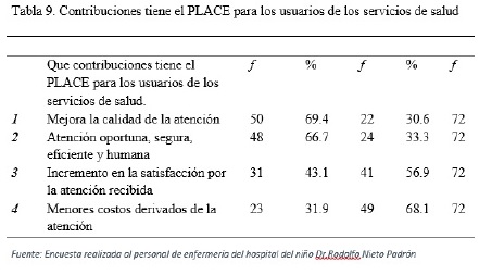 La contribuciones del PLACE para los usuarios de los servicios de salud el 69.4% mejora la calidad de la atención, 66.7% que influye para una atención oportuna, segura, eficiente y humana, 43.1% afirma que incrementa la satisfacción por la atención recibida y el 31.9% ayuda a reducir los costos derivados de la atención.