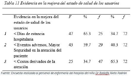 En el monitoreo de la calidad de la atención de enfermería a través de los INDICAS, el 9 de cada 10 enfermeras sostiene que mejora el cuidado con el uso de protocolos de prevención ulcera por presión y caídas y la mitad de la muestra considera que mejora la dimensión interpersonal del cuidado o trato digno, en las evidencias en la mejora del estado de salud de los usuarios 6 de cada 10 sostiene que presentan menor días de estancia hospitalaria y que experimentan menos eventos adversos, mayor seguridad en la atención del paciente y 4 de cada 10 enfermeras que reducen los costos derivados de la atención. Se encontraron trabajos previos (Cachón Pérez C. Álvarez-López 2011) , (Gonzales Aguña 2014).Así mismo Andagana en el (2011) realizo un estudio sobre la existencia de una guía de cuidados estandarizada genera beneficios tanto al paciente, a la familia, al personal sanitario y a la institución ya que previene complicaciones y disminuye la estancia de los pacientes ingresados reduciendo costos y facilitando la recuperación del paciente.