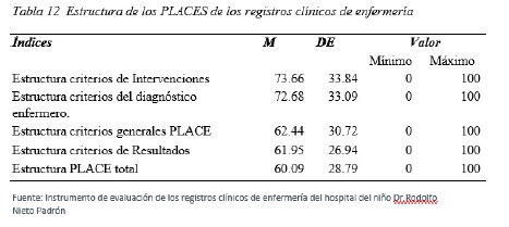 Resultados: índice global de la calidad del cuidado fue de 51.la estructura de los diagnósticos enfermeros formulados por las enfermeras, los diagnósticos de riesgo cumple 84. %, los reales 81.9% y los de salud o bienestar cumple con 65.3%.la estructura de los PLACE obtuvo un índice general de 73.66 (DE=33.84).