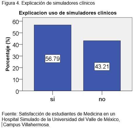 Más que la mayoría de la población estudiantil (56.8 %) mencionó que se les explicó el uso de los simuladores clínicos al inicio y entrada al Hospital Simulado, el 43.2 % negaron lo anterior. Figura 4