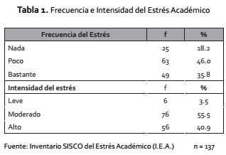 Los resultados de este estudio confirman la existencia del estrés en los estudiantes, de forma poco frecuente con una intensidad moderada, coincidiendo con lo reportado en los estudios de Barraza 11, señalando que el estrés se presentó algunas veces y en el de Polo et al.17, en la percepción del estrés de una forma elevada.