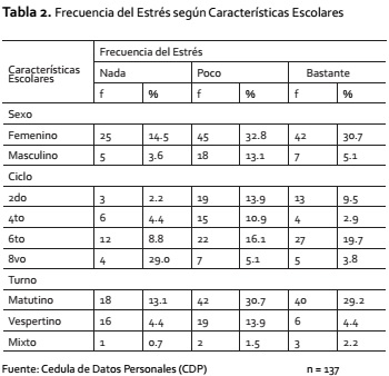 En relación al estrés con las características escolares, se presentó bastante en el sexo femenino 30.7% y poco frecuente en el masculino 13.1%, por ciclo; quienes cursan el 6to ciclo, 19.7% de ellos calificó como bastante la frecuencia del estrés, sólo 29% de los estudiantes del 8vo. ciclo refirieron no presentar estrés; por turno se observa que 29.2% de los que estudian en el turno matutino son quienes reportan la frecuencia de estrés como bastante (Tabla 2).