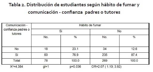 En los factores familiares se encontró que es 2,07 veces más frecuente adquirir el hábito de fumar cuando no hay comunicación y confianza con los padres o tutores, de forma que el verdadero valor de este parámetro se encuentra entre 1.10 y 3.92 (Tabla 2). También resulta 2,56 veces más frecuente si tienen amigos fumadores, siendo el verdadero valor de la variable 1.40 y 4.67. (Tabla 3). Ambos con una confiabilidad de 95%.