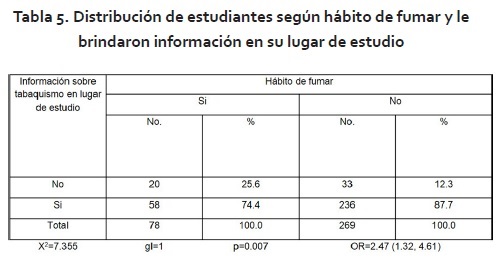 En los socio culturales resultó el nivel socioeconómico, encontrando que es 3,45 veces más frecuente adquirir el hábito de fumar cuando no se tiene nivel socio económico alto, de forma que el verdadero valor de este parámetro se encuentra entre 1.41 y 8.46 (Tabla 4). También resulta 2,47 veces más frecuente si no se dispone de información sobre tabaquismo en lugar de estudio, siendo el verdadero valor de la variable 1.32 y 4.61. (Tabla 5). Ambos con una confiabilidad de 95%.