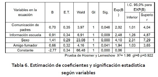 Se seleccionaron las variables del modelo en cuatro pasos, en el primer paso, el sexo, luego información sobre tabaquismo en el lugar de estudio, en el tercero la variable amigos o pares fumadores y en el último la comunicación y confianza con los padres o tutores. La única variable que no resultó seleccionada fue el nivel socioeconómico. Los resultados de la Prueba de Hosmer y Lemeshow indican que el modelo es adecuado a los datos.
