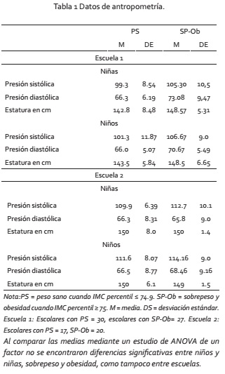 Al comparar las medias mediante un estudio de ANOVA de un factor no se encontraron diferencias significativas entre niños y niñas, sobrepeso y obesidad, como tampoco entre escuelas.