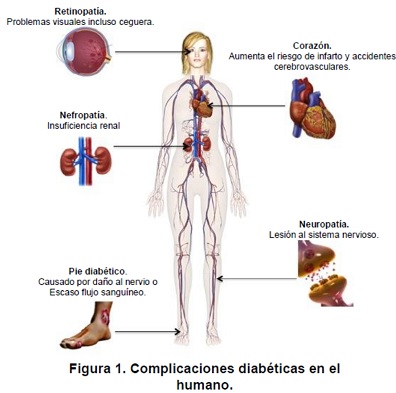 La hiperglicemia provoca daños macrovasculares (infarto al miocardio, accidentes cerebrovasculares y enfermedades vasculares periféricas) y por afectación microvasculares, ocasiona daño a grupos celulares específicos como las células del endotelio vascular en la retina (retinopatía), las células mesangiales en el glomérulo renal (nefropatía), los axones y células de Schwann en los nervios periféricos (neuropatía)6,7 (Figura 1). La neuropatía diabética es la complicación dolorosa de la diabetes, esta se define como "la presencia de síntomas o signos de disfunción del nervio periférico en personas con diabetes después de la exclusión de otras causas"7.