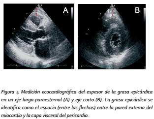 La razón por la cual la grasa epicárdica debe ser medida al final de la sístole es que durante la diástole esta se comprime, dando lugar a medidas poco exactas. Los estudiospoblacionales han demostrado pocavariabilidad intraobservadoreinterobservador.17 Además, lamedición ecocardiográfica del espesor del TAE es un método no invasivo, confiable, fácilmente reproducible y constituye una medida directa de la verdadera grasa visceral del corazón, que puede ser realizado de rutina en pacientes considerados de alto riesgo cardiometabólico sin ningún costo adicional, ya que no requiere preparación previa y se realiza en una vista ecocardiográfica paraesternal larga o paraesternal corta, utilizadas a menudo para evaluar otros parámetros cardiovasculares tradicionales. Indudablemente, la medición de la circunferencia abdominal es el marcador de grasa visceral más económico y accesible; sin embargo, este resulta poco sensible y específico para medir adiposidad visceral ya que incluye adiposidad subcutánea, la cual no se asocia con riesgo cardiometabólico.18 A pesar de estas ventajas, la ecocardiografía puede no ser la técnica óptima para la cuantificacióndelTAE, dadoqueestemétodonospermite obtener medidas lineales en una localización simple y por ende no refleja el volumen del TAE, a diferencia de otros métodos de imágenes más sensibles y específicos como la tomografía computarizada multicorte (TCM) y la resonancia magnética (RM), las cuales son consideradas las pruebas de oro para la cuantificación del TAV en virtud de la exactitud en las medidas, la baja variabilidad y alta reproducibilidad de los resultados, teniendo pocas ventajas un método con respecto al otro.19