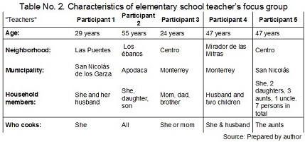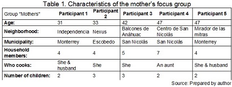 All the focus groups comprised 5 persons (criteria: uneven numbers, peers in similarity, homogeneous, not having met before). The contact was established at public schools, identifying those found in various socioeconomic areas of the metropolitan area of Monterrey. The invitation to participate was direct and the reason for the focus group and use to which information would be devoted were informed.
