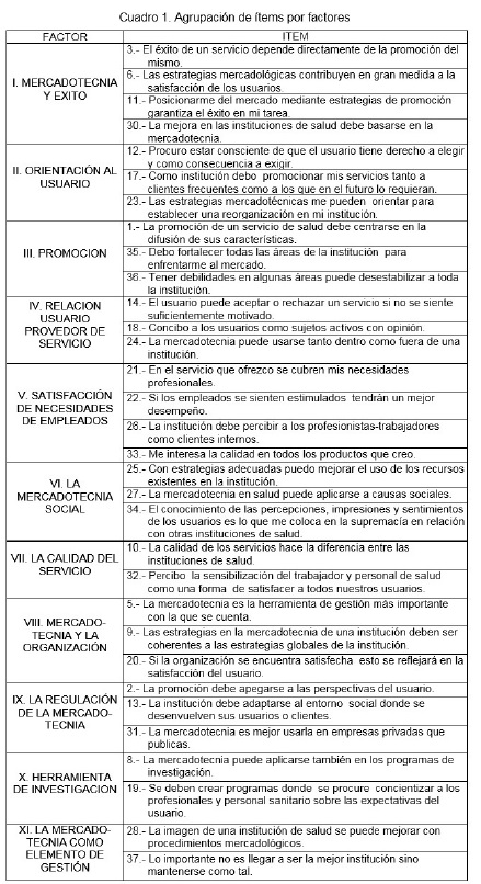 Colombia. De manera particular, los ítems que evidencian una actitud más favorable son: 22 "Si los empleados se sienten estimulados tendrán un mejor desempeño" y 33 "Me interesa la calidad en todos los productos que creo" (i.i);i7 "Como institución debo promocionar mis servicios tanto a clientes frecuentes como a los que en el futuro lo requieran", 24 "La mercadotecnia puede usarse tanto dentro como fuera de una institución" y 28 "La imagen de una institución de salud se puede mejorar con procedimientos mercadológicos" (1.2). El ítem en el que se manifestaron en desacuerdo: 31 "La mercadotecnia es mejor usarla en empresas privadas que públicas" (3.1), esto significa justamente una actitud favorable hacia la mercadotecnia aplicada a la salud.