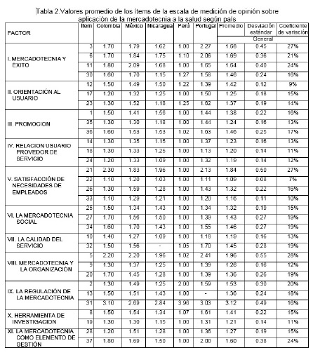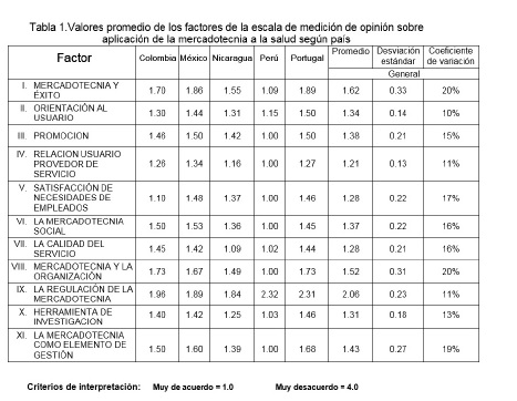 La aplicación de la mercadotecnia en los servicios de salud resulta favorecida con relación a su enfoque social en todos los países; la relación usuario proveedor y satisfacción de necesidades de los empleados ocupan lugares más cercanos al total acuerdo en los factores de todos los países; mientras que calidad del servicio y la orientación al usuario, tienen un lugar intermedio entre totalmente en acuerdo y algo de acuerdo; en lo que respecta a los factores de promoción de la salud y mercadotecnia social y en cada uno de sus ítems, no obtuvieron las mejores valoraciones.