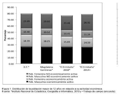En lo que respecta a la población encuestada económicamente activa, sobresale el bajo porcentaje de población femenina con un 14.59%, con respecto al 26.56% de hombres, este patrón se ha mantenido al paso de los años tanto en la entidad, en la delegación y en la colonia,16 como se observa en la Figura 1.