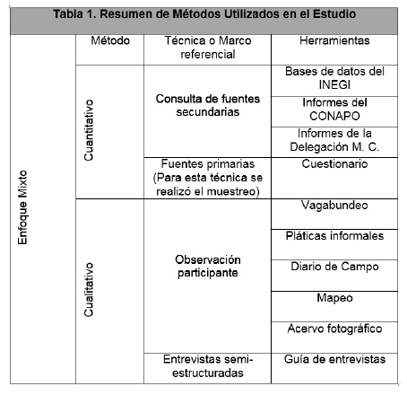 Materiales y métodos: Aproximación mixta desarrollada durante 2014, se aplicaron 105 cuestionarios y ocho entrevistas semi-estructuradas a jefas del hogar residentes de "El Ermitaño", D.F. Los temas abarcados fueron aspectos socio-demográficos, socioeconómicos, vivienda, ambiente, estilos de vida, condiciones y percepción de salud y necesidades sentidas. Se calcularon medidas de tendencia central para datos cuantitativos y se analizaron las entrevistas utilizando el software ATLAS.ti.