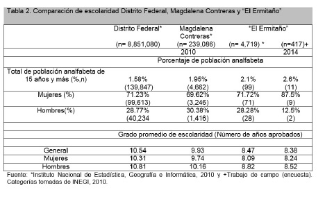El porcentaje de falta de educación en "El Ermitaño" es superior al de la delegación Magdalena Contreras.16 El 90% de la población que no cuenta con educación básica son mujeres; así mismo, en la colonia vecina "Tierra Unida", el grado promedio de escolaridad es mayor que en "El Ermitaño" por un año escolar (3er grado, 2do grado de secundaria respectivamente). En la población urbano-marginada de Tecamachalco, ubicada al noroeste del D.F., es predominante la educación media básica.23