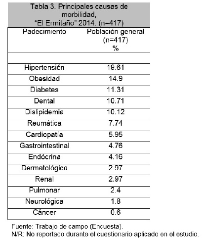 De acuerdo a la información recabada en los cuestionarios, las principales enfermedades en la población son crónico-degenerativas (Tabla 3). De los encuestados, 56% describió su estado de salud como bueno, 39% regular y 3% malo.