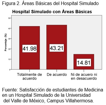 En relación a la opinión de los alumnos al tema de contar con las áreas básicas el Hospital Simulado, 34 alumnos refirieron estar totalmente de acuerdo con lo mencionado (41.98 %), 35 estudiantes aludieron estar de acuerdo a lo citado (43.21 %) y 12 mencionaron no estar ni de acuerdo ni en desacuerdo (14.81 %). Figura 2