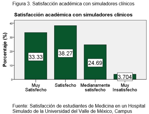 Acorde a la satisfacción académica percibida por los alumnos, en relación a los simuladores clínicos, 27 estudiantes (33.33 %) mencionaron estar Muy satisfechos con los simuladores, 31 alumnos (38.27 %) citaron estar satisfechos, 20 estudiantes mencionaron estar medianamente satisfechos (24.69 %) y tres refirieron estar muy insatisfechos (3.74 %). Figura 3.