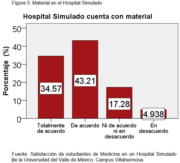 En relación con el material disponible dentro del Hospital Simulado para la correcta ejecución de las prácticas clínicas realizadas en él, 28 estudiantes mencionaron que las instalaciones cuentan con los insumos necesarios para ejecutar las sesiones (34.57 %), 35 estudiantes mencionaron que estaban de acuerdo con lo citado (43.21 %), 14 estudiantes aludieron que no se encontraban ni de acuerdo ni en desacuerdo (17.28 %) y cuatro alumnos citaron que se encontraban en desacuerdo en relación con la presencia de materiales suficientes para el Hospital Simulado. Figura 5.