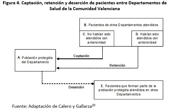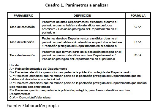 Metodológicamente se ha realizado un análisis confirmatorio empleando una fuente secundaria que consiste en una base de datos interna de la Conselleria de Sanidad de la Comunidad Valenciana denominada COMPAS21. Se trata de una herramienta informática que permite la recogida y el tratamiento de los flujos de pacientes y asistencias entre Departamentos, recogiéndose más de 12 millones de asistencias en el año 2012, y pudiéndose calcular las tasas de captación, retención y deserción de pacientes de cada Departamento de Salud, identificando el diagnóstico del paciente y la especialidad en que fue atendido. La Figura 4 y el Cuadro 1 explican la definición de estos parámetros adaptada al ámbito de la sanidad pública valenciana.