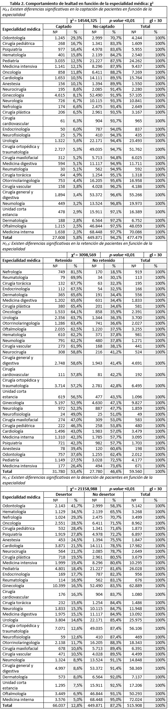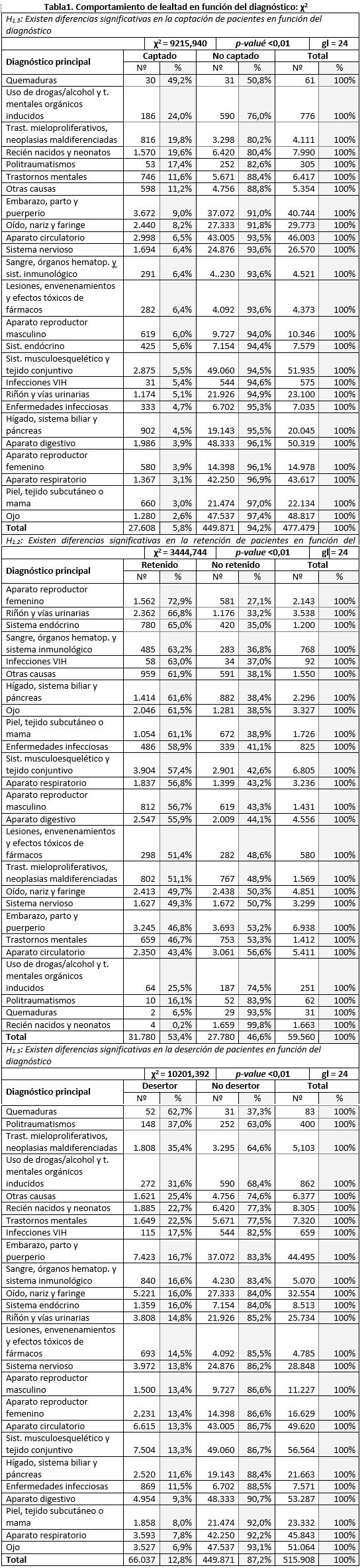 A efectos de explicar la lealtad del paciente en función de su diagnóstico, la tabla 1 muestra los resultados del contraste de hipótesis realizado, ordenados de mayor a menor porcentaje de pacientes captados, retenidos o desertores, respectivamente