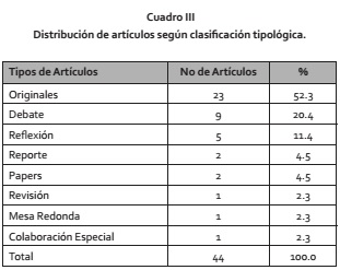 En el Cuadro III se observa un predominio de los artículos originales, en segundo lugar se ubican los artículos de debate con (9-20.4%) y en tercer lugar los artículos de reflexión con el 11.4%.