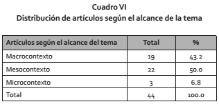 Según el alcance del tema RISS se clasificaron los artículos en 3 categorías, de ellos el 50% trabajó con el mesocontexto y el 43.2% con el macro contexto, es decir en su mayoría el tema fue abordado desde una perspectiva general y no aplicada a un problema en particular lo que aparece recogido en el Cuadro VI.