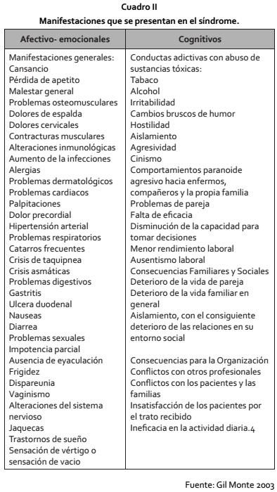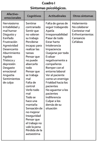 Gil y Monte describen los síntomas psicológicos, presentan un cuadro dividido en factores afectivos- emocionales, cognitivos, actitudinales y otros.