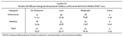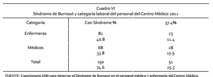 Esta tabla muestra la diferencia del personal que presenta el síndrome por las categorías agrupadas en porcentaje total, donde las enfermeras presentaron el mayor en relación con los médicos.