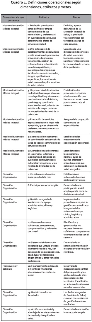 Una vez revisada la literatura, se conformaron las definiciones operacionales a partir de la decisión por parte de los autores de adoptar, para abarcar el sistema complejo12 que sería objeto de investigación, un grupo de dimensiones, atributos, metas y criterios de la integración. Para la adopción de las dimensiones, se partió del enfoque de Londoño y Frenk13 diseñadas para el análisis de las funciones de los sistemas de salud. La organización en funciones de los sistemas sanitarios que aportaba la literatura revisada se cruzó, para analizar un posible paralelismo de significados y alcance, con las áreas que agrupan los atributos para la red integrada de servicios de salud que propone la OPS, enfocados en la integración de redes de servicios.