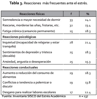 La evento estresantemás reportado fue la sobrecarga de tareas y los trabajos escolares, seguida de las evaluaciones del profesor (exámenes, trabajos, etc...). En lo que se refiere a la reacción estresante física, la somnolencia o mayor necesidad de dormir fue la más frecuente, la inquietud (incapacidad de relajarse y estar tranquilo) en el caso de la reacción psicológica y el aumento o reducción de alimentos fue la más reportada en las reacciones conductuales.