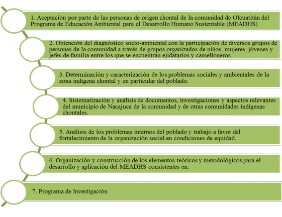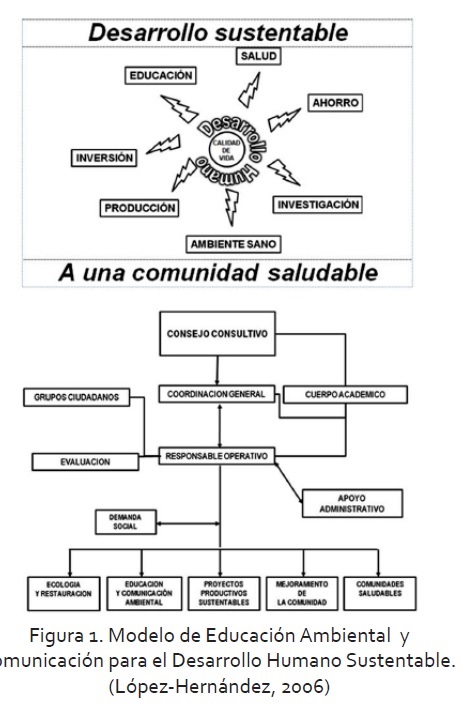 La expectativa de contar con un Plan Maestro de desarrollo sustentable local con alternativas para la producción, gestión de ecosistemas, transformación de productos y comercialización. (López-Hernández 2000; 2002; 2003). Las deducciones concernientes a los problemas socio-ambientales que merecen un enfoque educativo y de comunicación parten de los conocimientos que hemos adquirido con la contribución de los grupos principales (niños, jóvenes, señoras, jefes de familia) de Olcuatitán, mediante el Modelo General de Educación Ambiental para el Desarrollo Humano Sustentable (MEADHS) (figura 1) e investigación-acción participativa.