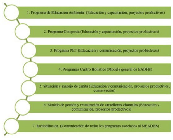 El modelo educativo consta de Principios filosóficos que determinan un concepto de educación y ser humano. Principios pedagógicos que establecen las formas que se deben manifestar en un proceso educativo y Matices, estrategias generales de los cuales se desprenderán acciones específicas como la comunicación ambiental. El MEADHS se basa en los saberes ambientales compartidos en el diálogo establecido con los grupos en talleres comunitarios, comunicando endógena y exógenamente los resultados para la comunicación de la información a la población local y fuera de la comunidad.