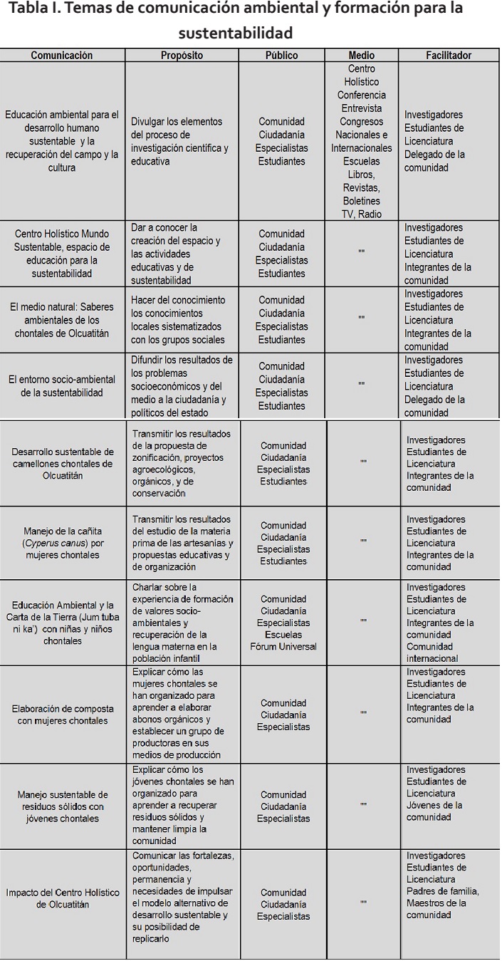 El trabajo comparte experiencias de un programa de educación y comunicación ambiental, extensión de valores proambientales mediante la sustentabilidad en diferentes comunidades de aprendizaje. Los supuestos concernientes a problemas socio-ambientales con enfoque educativo y de comunicación parten de conocimientos adquiridos con los grupos de Olcuatitán. La comunicación de estos resultados parte de una evaluación científica. Forma a los grupos hacia posibles soluciones de su problemática. Revertir los conocimientos sistematizados de los saberes ambientales y otros tópicos en la comunidad chontal posibilitó diseñar diversos proyectos educativos, culturales y de sustentabilidad. La comunicación en programas radiofónicos implicó facilitar y divulgar las acciones concernientes a conservar el medio en la sociedad. En un medio masivo de comunicación como la radio, difundimos nuestra filosofía, acciones diversas de gestión y protección ambiental, entre otras, y actividades de nuestras asociaciones civiles y académicas. En otros medios comunicamos diversos resultados y reflexiones hacia la ciudadanía para el uso de recursos del planeta con sentido humano. Producción de emisiones en el medio radiofónico como cápsulas, entrevistas con temáticas interesantes, y complementariamente se extendieron en foros científicos, exposiciones itinerantes, congresos, conferencias así como variadas publicaciones científicas y de divulgación con la extensión de estos resultados en las redes sociales.