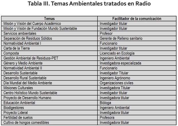 Para extender la comunicación a medios masivos se produjeron programas radiofónicos. (Tabla III). Nuestra misión fue establecer el compromiso de protección y conservación del Medio Ambiente ante la sociedad de Tabasco y el sureste de México a través con la emisión en un medio masivo de comunicación como la radio, de la filosofía, las acciones de gestión de residuos y protección ambiental que realiza y de las actividades de desarrollo sustentable que viene aplicando con la colaboración de la sociedad civil y la Fundación Mundo Sustentable.