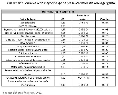 En el siguiente cuadro se pueden apreciar los factores de riesgo y sus respectivos datos, para la aparición de molestias en la garganta.