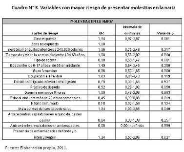En el Cuadro 3 se exponen los resultados de los factores de riesgo asociados a la aparición de molestias en la nariz y sus respectivos datos.