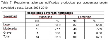 Este trabajo tuvo como propósito caracterizar las reacciones adversas asociadas a la práctica de acupuntura como modalidad terapéutica de la medicina tradicional en Cuba, en el período 2003 -2010.