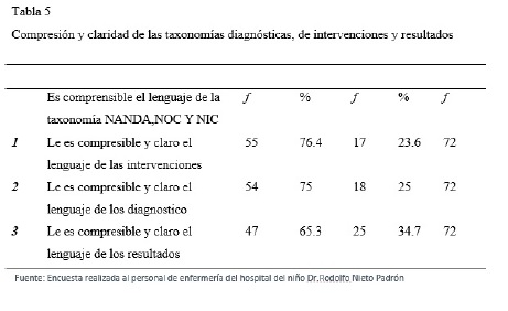 Manejo de las taxonomías de diagnósticos, resultados e intervenciones, se encontró que en relación a la estructura de los diagnósticos formulados por las enfermeras, los diagnósticos de riesgo y reales si cumplen pero de promoción de la salud presentan ciertas dificultades en el manejo de esos diagnósticos.