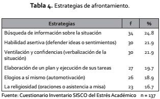 En la Tabla 4 se muestran las estrategias utilizadas por los estudiantes para manejar el estrés de una forma positiva, las más utilizadas fueron: la búsqueda de la información 24.8%, habilidad asertiva 21.9%, elaboración de plan y ejecución de tareas 19.7%, conducta y personalidad del profesor(a) 26.3%.