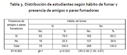 Tener amigos o pares fumadores constituye un factor de riesgo por lo que los programas de prevención y control del tabaquismo deben propiciar el desarrollo de estrategias de afrontamiento para resistir las presiones del medio.