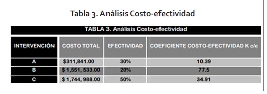 Se utilizó la herramienta de costo- efectividad, donde se empleó el cálculo del coeficiente costo efectividad para identificar la intervención más costo-efectiva. El efecto es de impacto, que se observa a largo plazo (1 año) en el que disminuirá la prevalencia de neuropatía secundaria a diabetes. A una efectividad de 30%, para la intervención B del 20 % y para la C del 50 %, esto se basa en bibliografía donde se justifican dichas intervenciones; para la intervención A, se menciona que la adherencia al tratamiento por parte de las personas diabéticas es más efectiva cuando la familia es parte de este proceso; para la intervención B se menciona en la ENSANUT 2012, que el porcentaje de la población con diabetes en quienes se realizó la revisión de pies en los servicios de medicina preventiva fue muy bajo para todos los grupos de edad, en ambos sexos.