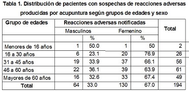 En los ocho años del periodo analizado se recibieron en la Unidad Coordinadora Nacional de Farmacovigilancia, 194 reportes de sospechas de reacciones adversas producidas por acupuntura. Las notificaciones de pacientes adultos comprendidos en las edades de 31 a 60 años, como se observa en la tabla 1, constituyeron más de la mitad (61.2%) de los reportes analizados, mientras que la edad pediátrica solo significó el 1.0% del total. Cabe señalar que los pacientes mayores de 60 años representaron un tercio del total 25.6 %. En cuanto al sexo, fueron en las féminas (67.0 %) donde más sospechas de reacción adveras ocurrieron con independencia de la edad.