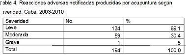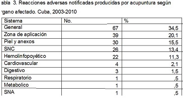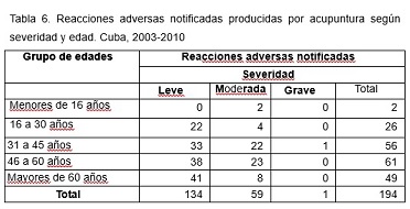 Este trabajo tuvo como propósito caracterizar las reacciones adversas asociadas a la práctica de acupuntura como modalidad terapéutica de la medicina tradicional en Cuba, en el período 2003 -2010.