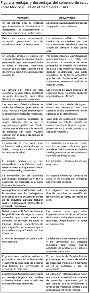 Objetivo: Identificar ventajas y desventajas a través de indicadores y tendencias del comercio de servicios de salud bajo la perspectiva del Tratado de Libre Comercio América del Norte (TLCAN). Material y método: Se realizaron análisis de tratados comerciales y acuerdos migratorios. Se plantea la revisión de acuerdos comerciales en materia de programas, servicios y seguros médicos y un análisis de los marcos jurídicos que sustenta la oferta y el acceso a servicios de salud en ambos países. Resultados: Bajo los elementos de implementar la identificación de escenarios que permitan el desarrollo de acciones binacionales de protección en salud para emigrantes mexicanos y sus familias en México y en USA. Se busca dar fuerza a la investigación de migración y salud, necesario por la sensibilidad política que el tema requiere; y presentando el Tratado de Libre Comercio de Norteamérica y de las nuevas estrategias de reforma de salud. Conclusiones: Existen iniciativas orientadas a realizar eventos que promuevan acceso y mejoramiento de la salud entre los habitantes de origen mexicano que viven y trabajan en los Estados Unidos y que no cuentan con seguro médico, como la semana Binacional de Salud. El programa Vete Sano Regresa Sano, donde participa el instituto de los mexicanos en el Exterior, órgano descentrado de la Secretaria de Relaciones Exteriores.