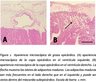 Además, una pequeña cantidad de tejido adiposo también se extiende de la superficie epicárdica al miocardio, a menudo siguiendo la adventicia de las ramas de las arterias coronarias. Resulta importante destacar que no hay fascia o tejidos similares que separen la grasa epicárdica del miocardio (Figura 2) e inclusive de los vasos coronarios, por lo cual ambos tejidos comparten la misma microcirculación, lo cual implica que hay una interacción importante entre estas estructuras.3